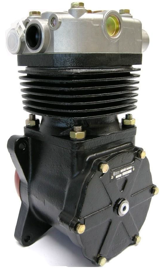 U jednoválcového, pístového kompresoru s přírubovým provedením skříně je mazání zajištěno tlakovým olejem, který je přiváděn trubkou od mazací soustavy motoru. Tato soustava dále zabezpečuje chlazení hlavy válce se sedlovou deskou ventilů. Žebrovaný válec kompresoru je chlazen vzduchem. Klikový hřídel je uložen ve dvou valivých ložiskách a opatřen kuželem pro nasazení ozubeného kola. Ojnice má dělenou hlavu, ve které je umístěno ložisko pro klikový čep a oko se zalisovaným pouzdrem pro pístní čep. Jazýčkové, lamelové ventily jsou samočinné.